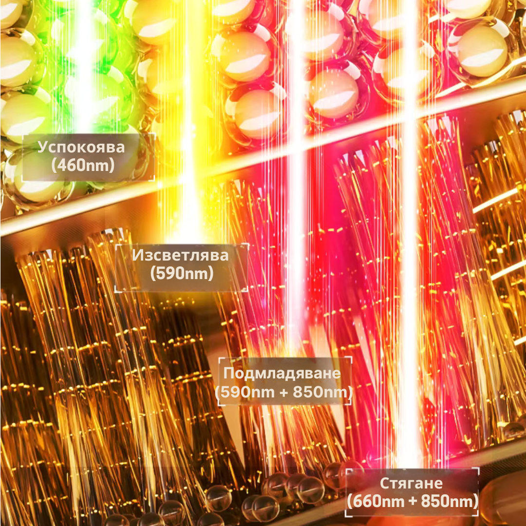 M3 – Подмладява (590nm + 850nm): Стимулира регенерацията и кръвообращението, намалява пигментацията.