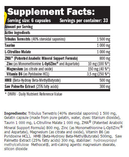 Формулата съдържа цитруллин малат, цинк, магнезий, витамин B6, таурин, HMB и екстракт от сау палмето. Тя работи синергично за стимулиране на естественото производство на тестостерон и за подобряване на възстановяването, енергията и общото представяне по време на тренировка. Препоръчително е да се комбинира с продукта Nitric Oxide за увеличено кръвообращение и производството на азотен оксид.