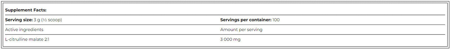 Повишеното производство на NO улеснява разширяването на кръвоносните съдове и оптимизира доставката на енергия до мускулите по време на тренировка, което може да доведе до по-добри показатели и по-бързо възстановяване след усилие. Формулата от 2:1 L-цитрулин малат е разработена за стабилно напомпване и по-добро усещане за мускулна съпротива по време на тренировка.