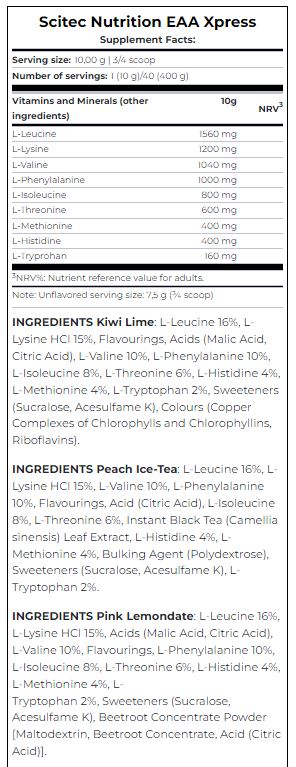 SCITEC EAA Xpress е висококачествена добавка, съдържаща комплекс от незаменими аминокиселини, които нашето тяло не може да произвежда само. Всеки ден, особено при интензивна физическа активност, е от съществено значение да осигурим адекватен прием на тези важни хранителни вещества. С една доза от EAA Xpress на SCITEC, вие получавате 50% от препоръчителния дневен прием на аминокиселини, което е идеално за подпомагане на мускулния растеж и възстановяване. Незаменимите аминокиселини играят ключова роля в синтеза на белтъците и подпомагат изграждането на нова мускулна тъкан.