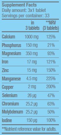 Тази формула комбинира ключови минерали като калций, магнезий и цинк, за да попълни минералните липси и да подпомогне възстановяването след физически натоварвания. Калцият и магнезият са от съществено значение за здрави кости и нормална мускулна функция, докато цинкът подкрепя метаболитните процеси и репродукцията, а хромът помага за поддържане на нормални нива в кръвта. Съставът е балансиран за дълготрайно снабдяване с минерали при активен начин на живот. Съхранявайте на сухо и хладно място, далеч от пряка слънчева светлина.