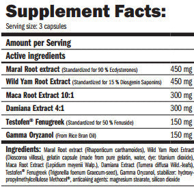 Съставът е изцяло натурален и включва левзея Carthamoide, корен от див сладък картоф, корен от перуанска мака, гама-оризанол и сминдух, които работят синергично за поддържането на нормалния тестостерон и баланса на естрогените в организма. Това подпомага силата, възстановяването и метаболизма по безопасен и естествен начин.
