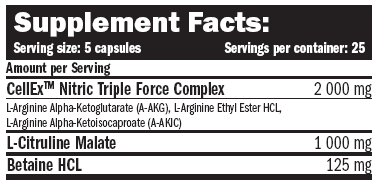 С патентована форма на L-аргинин контролира нивата на азотен оксид в организма. L-аргинин алфа-кетоглутарат (A-AKG) повишава синтеза на протеини и подпомага растежа на чиста мускулна маса, докато L-аргининовият естер насърчава производството на хормон на растежа и подобрява притока на кислород и хранителни вещества към мускулите. Добавени са L-аргинин алфа-кетоизокапроат (A-AKIC), който подпомага изграждането на мускулна тъкан, неутрализира свободните радикали и подсилва имунната система.