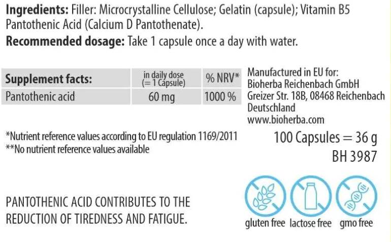 Пантотенова киселина участва в метаболизма на мазнини и въглехидрати и е ключова за формирането на коензим A (CoA), който съдействат за енергийните процеси в организма. Формулата използва USP пантотенова киселина (as d-calcium pantothenate), осигуряваща стабилен и удобен източник на витамин B-5. Подходяща е за спортисти и за всеки, който желае поддържане на нормално ниво на енергия през деня.