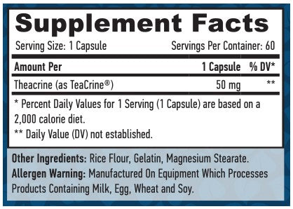 Teacrine е съединение, което подобрява енергийния статус и невроналната комуникация в организма. За разлика от кофеина, теакринът не предизвиква излишна нервност или резки спадове на енергията. Нивото на активност се повишава плавно и устойчиво, което помага да сте нащрек и продуктивни през целия ден. Продуктът е подходящ за активно спортуващи, както и за всеки, който желае дълготрайна енергия без да се уморява бързо.
