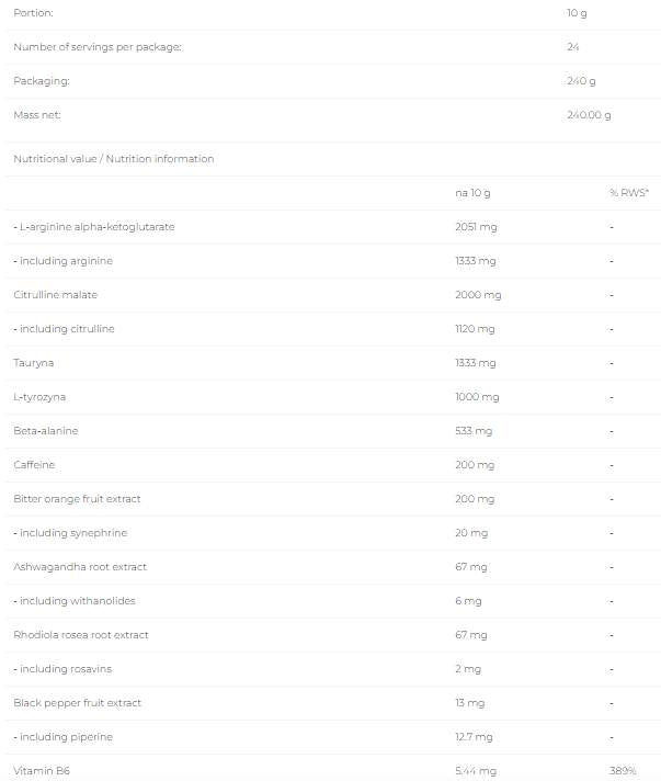 Ultimate Pre-Workout BESTIA е перфектна комбинация от аминокиселини, кофеин и естествени екстракти като ашваганда и родиола. В продукта ще откриете вещества, които подпомагат метаболизма, включително екстракт от горчив портокал. Това означава, че PRE-workout BESTIA може да се използва успешно и от хора, фокусирани върху рекомпозицията на тялото и целящи мускулна поддръжка по време на интензивни тренировки.