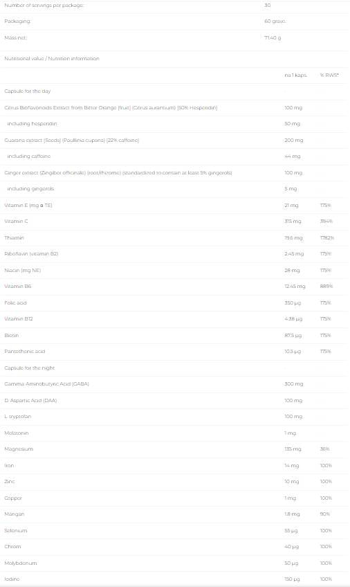 • Нощен комплекс: Съдържа минерали и важни съставки като гама-аминомаслена киселина (GABA), D-аспарагинова киселина (DAA) и мелатонин, които подпомагат релаксацията и качествения сън.