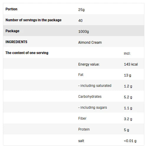 Разфасовка: 500 г или 1000 г, подходяща за домашно ползване или по-дълъг запас. Той е източник на протеини и фибри, без глутен, без лактоза, без добавени захари и без ГМО, което го прави подходящ за различни диети и хранителни режими. Кремът доставя есенциални мастни киселини, витамин Е и витамин B1, подпомагащи общото благосъстояние и възстановяването след тренировка.