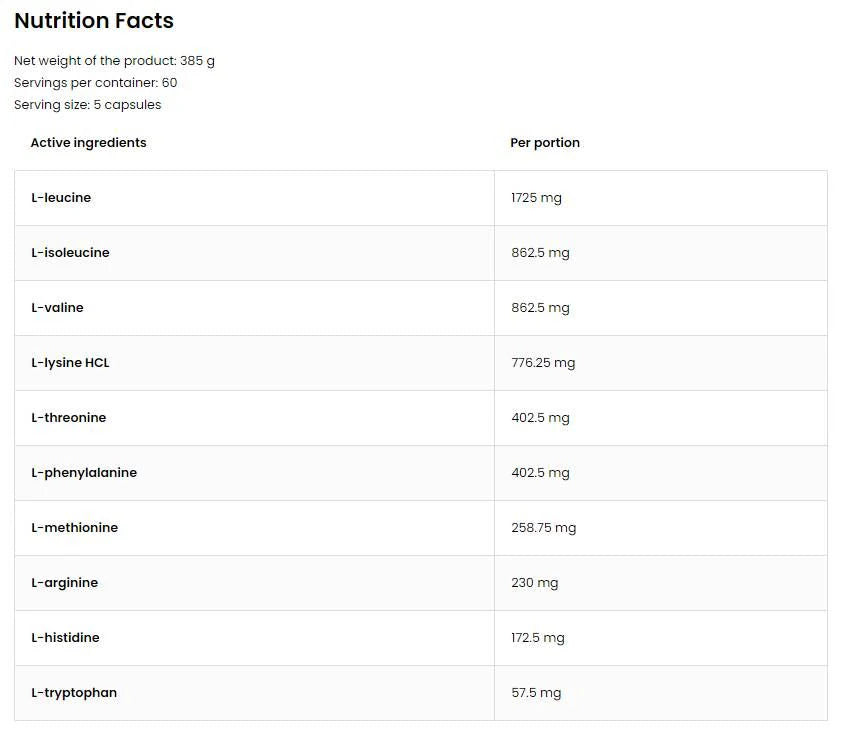 Съставът на продукта включва BCAA комплекс, т.е. три дълговерижни аминокиселини: левцин, валин и изолевцин и в допълнение съединения като: лизин, треонин, фенилаланин, метионин, аргинин, хистидин и триптофан.