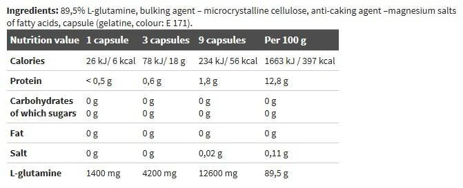 100% фармацевтично чист л-глутамин на капсули по 1400 мг. Глутаминът на практика е най-често срещаната аминокиселина в тялото. Той съставлява около 60% от мускулите и над 20% от аминокиселините в тялото. Сред многобройните му положителни ефекти за организма са: