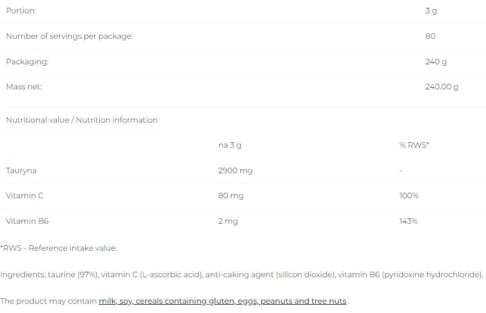 Представяме ви Taurine+ – вашият идеален партньор за постигане на високи спортни резултати! Тази хранителна добавка под формата на прах е обогатена с таурин, витамин С и витамин В6, което я прави отличен избор за предтренировъчна формула, особено по време на интензивни тренировки.