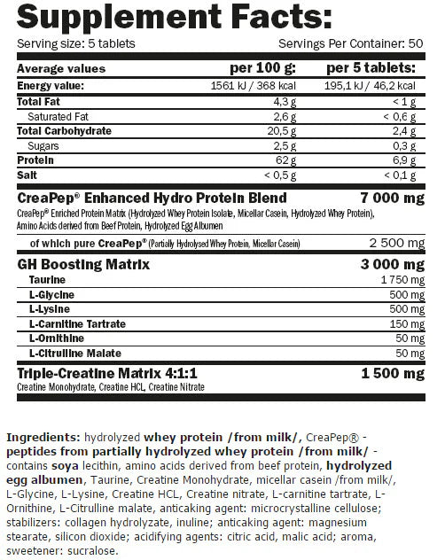 Съчетанието от аминокиселини, пептиди CreaPep и три вида креатин осигурява оптимална среда за мускулен растеж. Продуктът работи чрез подкрепа на протеиновия синтез, повишено усвояване на креатин и ускорено възстановяване след тежки тренировки. GH-матрицата от таурин, глицин, лизин, L-карнитин, L-орнитин и L-цитрулин допринася за повишаване на естествения растежен хормон, което подпомага възстановяването и изграждането на чиста мускулна маса.