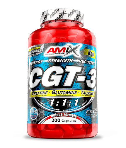 Amix CGT-3 е специално разработена формула, която използва тройна креа-матрица и двойна глута-матрица, за да подпомогне растежа на мускулите, да увеличи силата и експлозивната мощ, и да ускори възстановяването след тренировка. Тази експлозивна комбинация от три форми на креатин (монохидрат, малат и CEE) и мощен комплекс от L-глутамин и L-глутамин AKG предоставя енергия за мускулите, ускорява протеиновия синтез и подпомага секрецията на хормона на растежа.