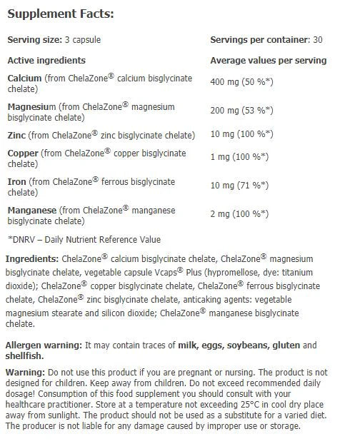 Съставки: ChelaZone® калциев бисглицинат хелат, ChelaZone® магнезиев бисглицинат хелат, растителна капсула Vcaps® Plus (хипромелоза, багрило: титанов диоксид); ChelaZone® меден бисглицинат хелат, ChelaZone® железен бисглицинат хелат, ChelaZone® цинков бисглицинат хелат, противослепващи агенти: растителен магнезиев стеарат и силициев диоксид; ChelaZone® манганов бисглицинат хелат.