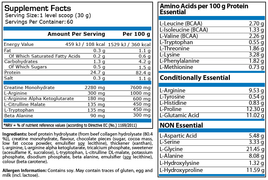 Телешкият протеин е с перфектен аминокиселинен профил, като е без глутен и лактоза. Това го прави идеален инструмент за възстановяване след тренировка или каквато и да е физическа активност!