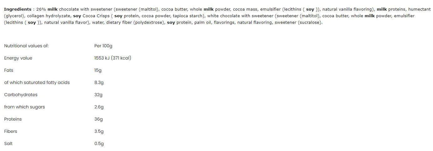 Съставки:26% млечен шоколад с подсладител (подсладител (малтитол), какаово масло, пълномаслено мляко на прах, какаова маса, емулгатор (лецитини (соя)), естествен ароматизант ванилия), млечни протеини, овлажнител (глицерол), колагенов хидролизат, соеви какаови криспита ( соев протеин, какао на прах, нишесте от тапиока), бял шоколад с подсладител (подсладител (малтитол), какаово масло, пълномаслено мляко на прах, емулгатор (лецитини (соя)), естествен ароматизант ванилия), вода, диетични фибри (полидекстроза), соев протеин , палмова мазнина, ароматизанти, естествен ароматизант, подсладител (сукралоза).