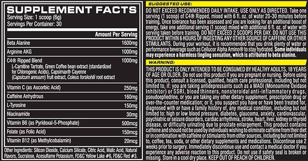 C4 Ripped комбинира силата на класическата формула C4 с патентованата C4 Ripped Blend, заредена с L-карнитин, екстракт от зелено кафe и Capsimax Cayenne. Това е специално разработена формула, насочена към активни спортисти и фитнес ентусиасти, които искат повече енергия по време на тренировка и по-ясно оформено тяло.