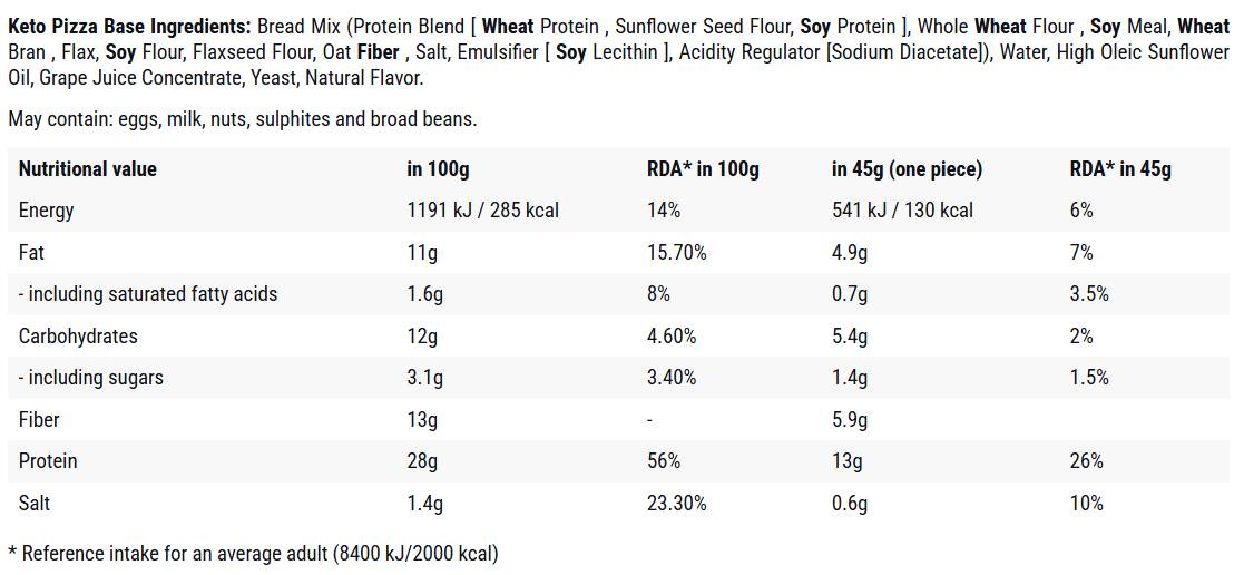 Keto Pizza Base е висококачествена пица основа с високо съдържание на протеин и ниско съдържание на въглехидрати, идеална за кето диета и след тренировка.