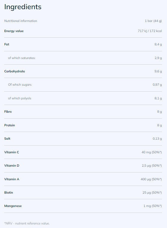 Съставки: 25% шоколад с подсладител [какаова маса, подсладител - малтитоли; какаово масло, емулгатор - лецитини (от соя); натурален аромат на ванилия], 13% рибни колагенови пептиди (риба), фруктоолигозахариди, изомалтоолигозахарид1 (от тапиока), овлажнители - глицерол, сорбитоли; растително масло (рапично), соев протеинов изолат, грахов протеин, соев чипс (соев протеинов изолат), 3% какао с намалено съдържание на мазнини, протеин от кафяв ориз, изомалтулоза2, сгъстител - арабска гума; ароматизатори, емулгатор - лецитини (от соя); L-аскорбинова киселина - вит. С, холекалциферол - вит. D, ретинил палмитат - вит. А, D-биотин - биотин, манганов глюконат