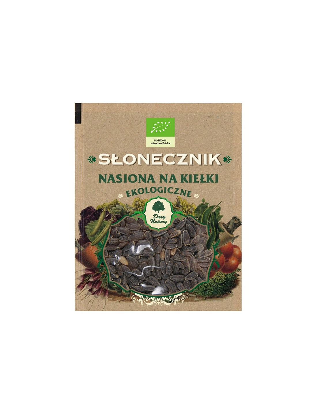 EKO nasiona na kiełki Słonecznik представлява био семена от слънчоглед за отглеждане на кълнове в домашни условия. Покълналите семена са едни от най-полезните и екологично чисти, живи храни за човешкия организъм. Отгледани в домашни условия са екологични, защото са сурови и не са третирани с торове и пестициди. Кълновете от слънчоглед съдържат много цинк, желязо, мед, фосфор, калций, сяра и витамини D и E. Препоръчват като допълнение към диети за отслабване и вегетарианско хранене. В домашни условия кълновете се приготвят по следния начин: Взима се суров белен слънчоглед, изчиства се, изплаква се и се слага с стъклен буркан. Напълнете буркана почти до горе с вода. Оставате слънчогледът да престои във водата между 6 и 12 часа. Вземете плоска тава или чиния, покрийте с марля и разстелете слънчогледовото семе. Всеки ден го промивайте. След 2-4 дни семенцата покълват. Преди консумация на кълновете ги изплакнете.