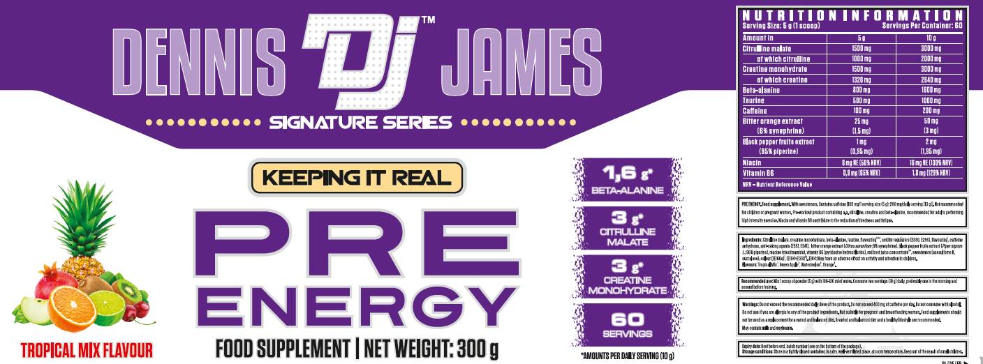 С Dennis James Signature Series Pre Energy можете да изведете тренировките си на следващото ниво и да постигнете вашите фитнес цели по-бързо. Тази предтренировъчна тренировка е стриктно тествана и проучена от фитнес професионалисти, за да се осигурят най-високи стандарти за качество и безопасност. Не съдържа вредни химикали и добавки, което го прави най-безопасното и най-силно предтренировъчно средство на пазара.