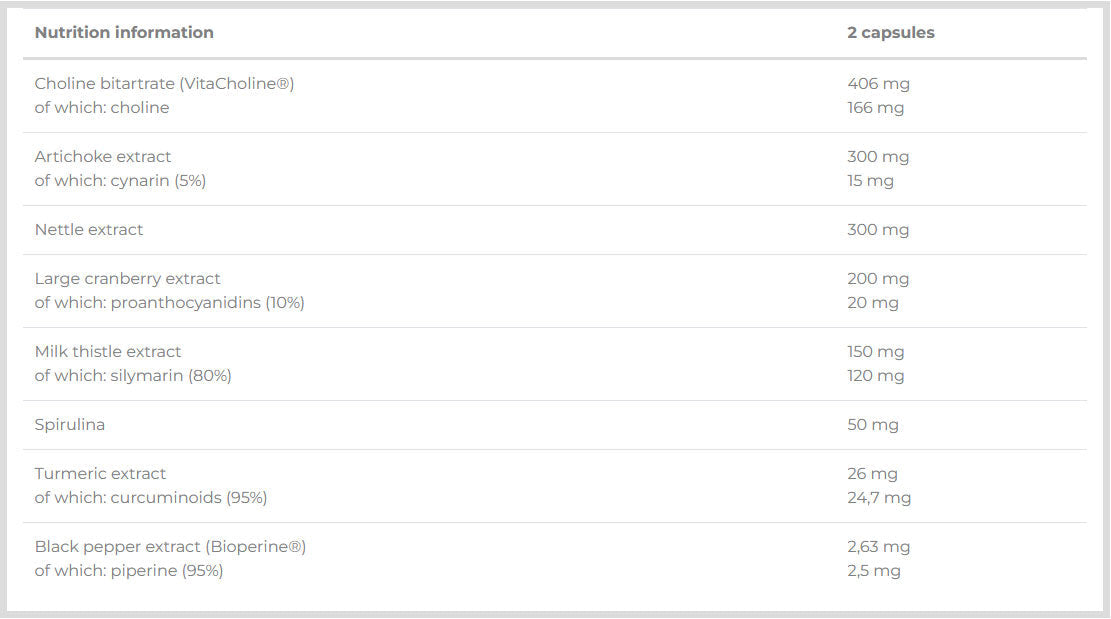 Добавеният холин подпомага обмяната на мазнините и нормалната функция на черния дроб, докато цялостният комплекс от екстракти и антиоксиданти осигурява поддържаща защита. Препоръчва се за редовна грижа за черния дроб, детоксикация и поддържане на добро храносмилане и имунитет.