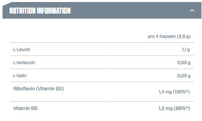 • Всяка доза съдържа 5 050 мг BCAA (L-валин, L-левцин, L-изолевцин).