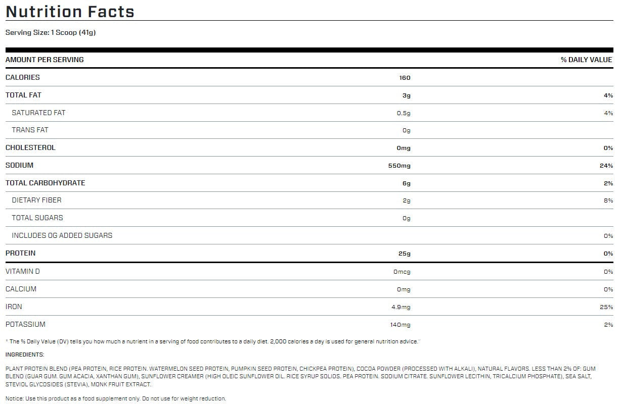 Съставки: смес от растителни протеини (грахов протеин, оризов протеин. протеин от семена на диня, протеин от тиквени семена, протеин от нахут), какао на прах (обработено с алкали), естествени аромати. по-малко от 2 % от: смес от гуми (гума гуар, гума акация, гума ксантан), слънчогледов крем (високоолеиново слънчогледово масло. твърди частици оризов сироп. белтъчини от pea. натриев цитрат. слънчогледов лецитин, трикалциев фосфат), морска сол, стевиолови гликозиди (стевия), сукралоза.