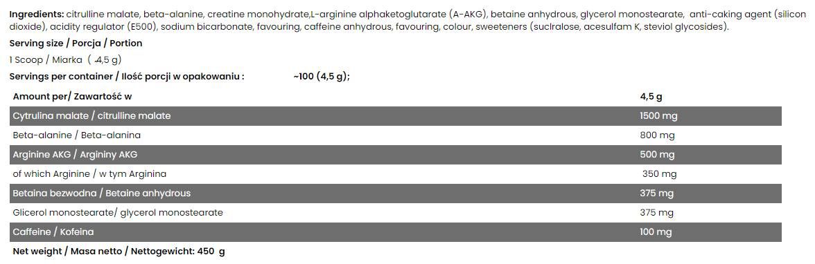 Продуктът осигурява зверско напомпване и чувство на безгранична сила. Формулата съдържа вещества като: