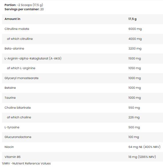 цитрулин малат, бета-аланин, L-аргинин алфакетоглутарат (A-AKG), стабилизатор (глицерил моностеарат), безводен бетаин, таурин, антислепващ агент (E551), регулатор на киселинността (E500(ii)), ароматизатори8, холин битартрат, овкусители 6,7,11, L-тирозин, овкусители 1,2,3,4,5,9, овкусител 10, сол, глюкуронолактон, ниацин (никотинова киселина), витамин В6 (пиридоксин хидрохлорид), концентрат от сок от червено цвекло 1,2, 4,5,6,9,10,11, концентрат от черен морков6, подсладители (ацесулфам К, сукралоза, стевиол гликозиди от стевия), оцветител/и [(E160a)3,4,5,7,8, (E104)3 , (E132)11]. E104: Може да има неблагоприятен ефект върху активността и вниманието при деца.