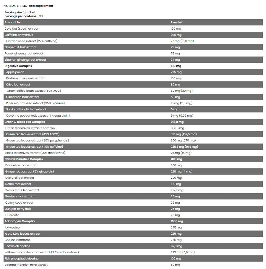 Xtreme Napalm Shred е фет бърнър, който има много специализирана формула, която съдържа комплекс от чай, кофеин, екстракт от семена на гуарана, джинджифил, има екстракти, които действат като диуретик и спомагат за засилване на метаболизма.
