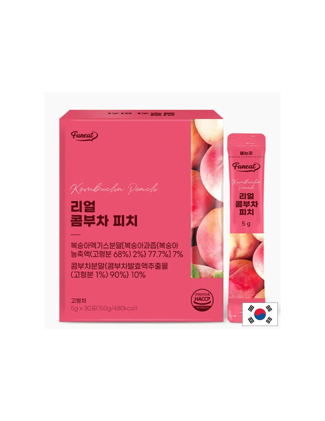 Съставки: Лимонена киселина, натриев бикарбонат, еритритол, екстракт от праскова на прах (20%), комбуча ферментирал екстракт на прах, ферментирал бананов екстракт (Израел), екстракт от ябълка, цвеклов екстракт, екстракт от праскова, декстрин, фруктозен сироп, смесени ензими, пробиотичен прах, ароматизанти, стевиол гликозиди, екстракт от черен чай, сукралоза, малтодекстрин, млечнокисели бактерии.