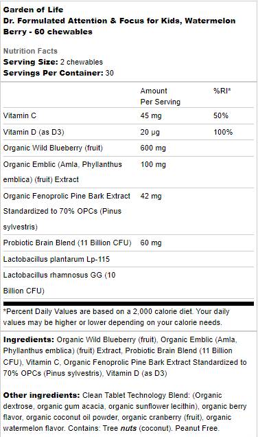 Dr. Formulated Attention & Focus for Kids е снабден с 10 милиарда CFU от Lactobacillus rhamnosus GG, който е един от най-изследваните живи бактериални щамове, хранителни вещества от Whole Food витамин D3 и витамин C и органични диви боровинки, всяко сладко дъвчене е предназначено специално за деца.