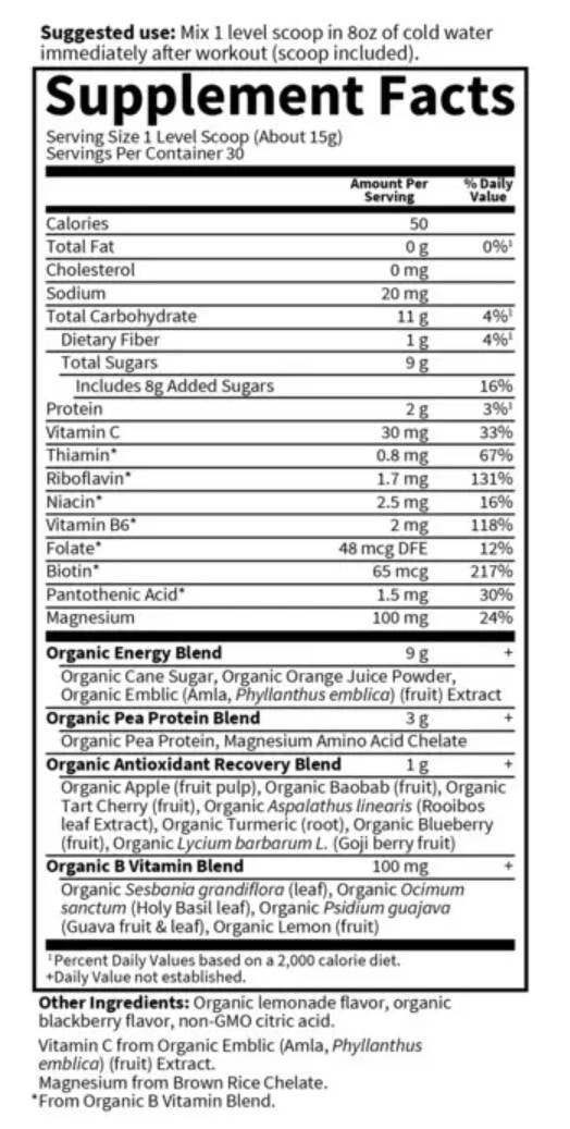 Organic Plant-Based Recovery включва органични тръпчиви череши, за които е доказано в проучвания, че намаляват мускулната болка, причинена от свободните радикали, произведени по време на интензивни упражнения.† Включени са също така органична куркума, органични плодове Gogi, органични боровинки, органични ябълки и органичен ройбос за подобряване на този антиоксидант мощност и за по-нататъшно намаляване на мускулната болка и подпомагане на възстановяването след усилени упражнения.