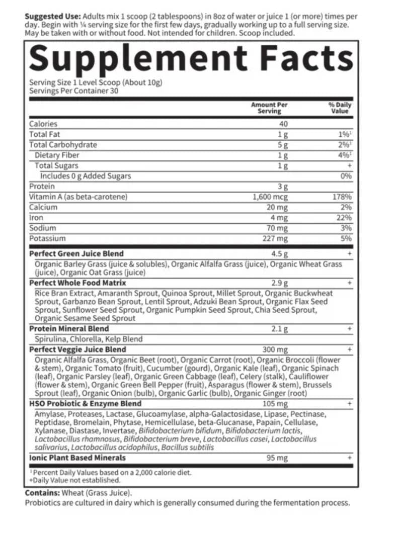 Направена със съставки от зеленчуци, кълнове и органични зърнени треви, една порция е еквивалентна на 148,5 грама пресен сок от трева, за да гарантира, че тялото ви получава хранителните ползи от множество порции плодове и зеленчуци всеки ден. Добавката с оригинална формула на Perfect Food съдържа антиоксидантни зелени треви , микроводорасли, морски зеленчуци, сокове от цели зеленчуци, зърнени храни, семена и бобови растения, плюс патентована смес от пробиотични микроорганизми и храносмилателни ензими на растителна основа. Perfect Food Original е идеален продукт за тези, които не могат да си набавят достатъчно зелени храни.