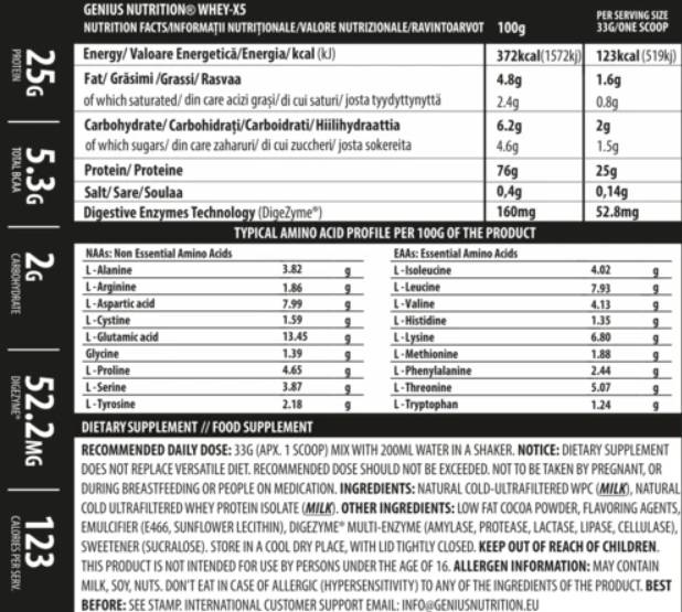 WHEY-X5 е прецизно формулиран за да ви помогне да натрупате и да поддържате мускулна маса без мазнини. Това се постига чрез бързото усвояване на суроватъчен протеин изолат и протеинов концентрат. Ние използваме възможно най-добрите аминокиселини с висока доза BCAA (5.3 g на доза), които се появяват по естествен път в суроватъчния протеин. Genius Nutrition използва най-високо качество 100% суроватъчен протеин, добит чрез естествена филтрация, който има високи свойства на абсорбиране и храносмилане, в комбинация с DIGEZYME® (храносмилателни ензими). WHEY-X5 има превъзходни хранителни свойства, които са важни за всеки, които иска да изгради мускулна маса без да съхранява мазнини, като същевременно продукта има невероятен вкус.