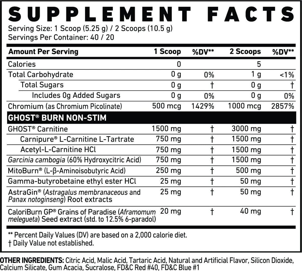 В допълнение към L-карнитина, Ghost е подсилил формулата Burn Non-Stim с богат списък от изследвани и патентовани вещества. BioPerine, MitoBurn, Astragin и CaloriBurn GP правят този продукт с най-високо качество. Тези съставки ви помагат да стимулирате метаболизма си и да абсорбирате веществата. И без стимуланти, тази формула не съдържа кофеин. По този начин можете да отслабнете оптимално, без да изпитвате ефекта на стимуланти.