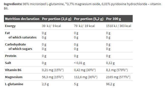Състав: 96% микронизиран L-глутамин, 3,7% магнезиев оксид, 0,01% пиридоксин хидрохлорид - витамин В6.