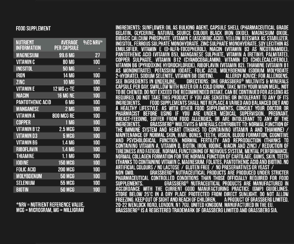 В забързаното ежедневие и за хора спазващи диета, често пъти е трудна задача да се набавят нужните витамини и минерали от разнообразна храна. Grassberg Multivits & Minerals ви дава възможност да го направите без да добавяте излишни калории към диетата си, което би могло да компрометира резултатите ви.