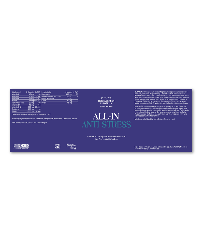 АНТИ СТРЕС - ALL–IN ANTI STRESS е иновативна хранителна добавка, проектирана да облекчи стреса и да подобри благосъстоянието ви. Съдържа мощна комбинация от активни витамини, магнезий, холин, бетаин и всички витамини от група B, които работят синергично, за да ви помогнат да се справите с ежедневните предизвикателства.