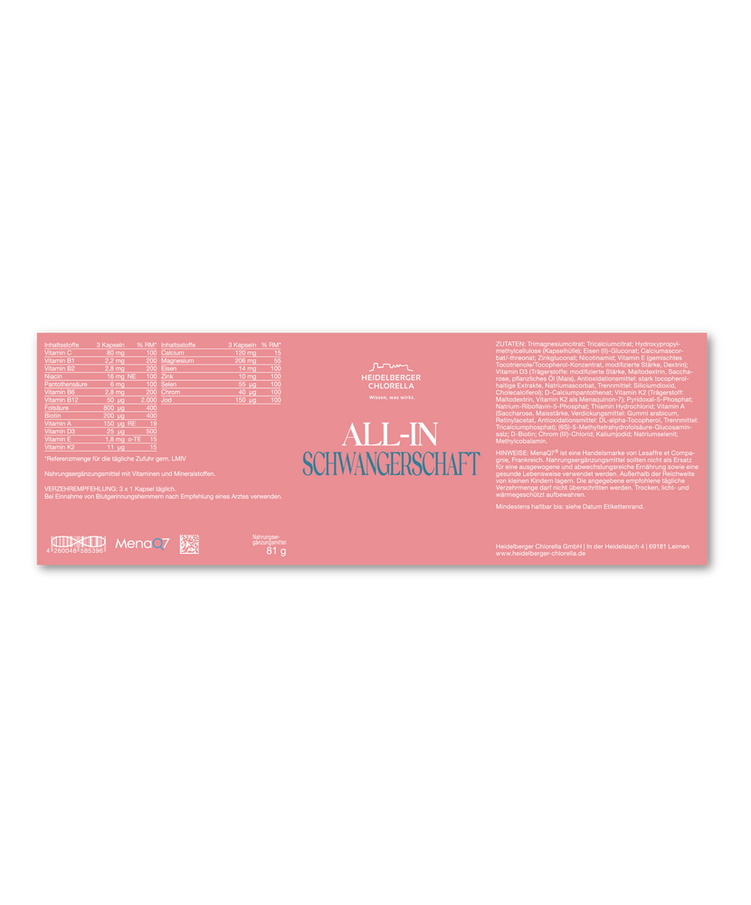 Запознайте се с БРЕМЕННОСТ - ALL–IN SCHWANGERSCHAFT - хранителна добавка, специално създадена, за да осигури необходимите витамини и минерали на бъдещите майки. С 90 капсули в опаковката, този продукт е идеалният помощник по време на планиране на бременност, по време на самата бременност и в периода на кърмене.