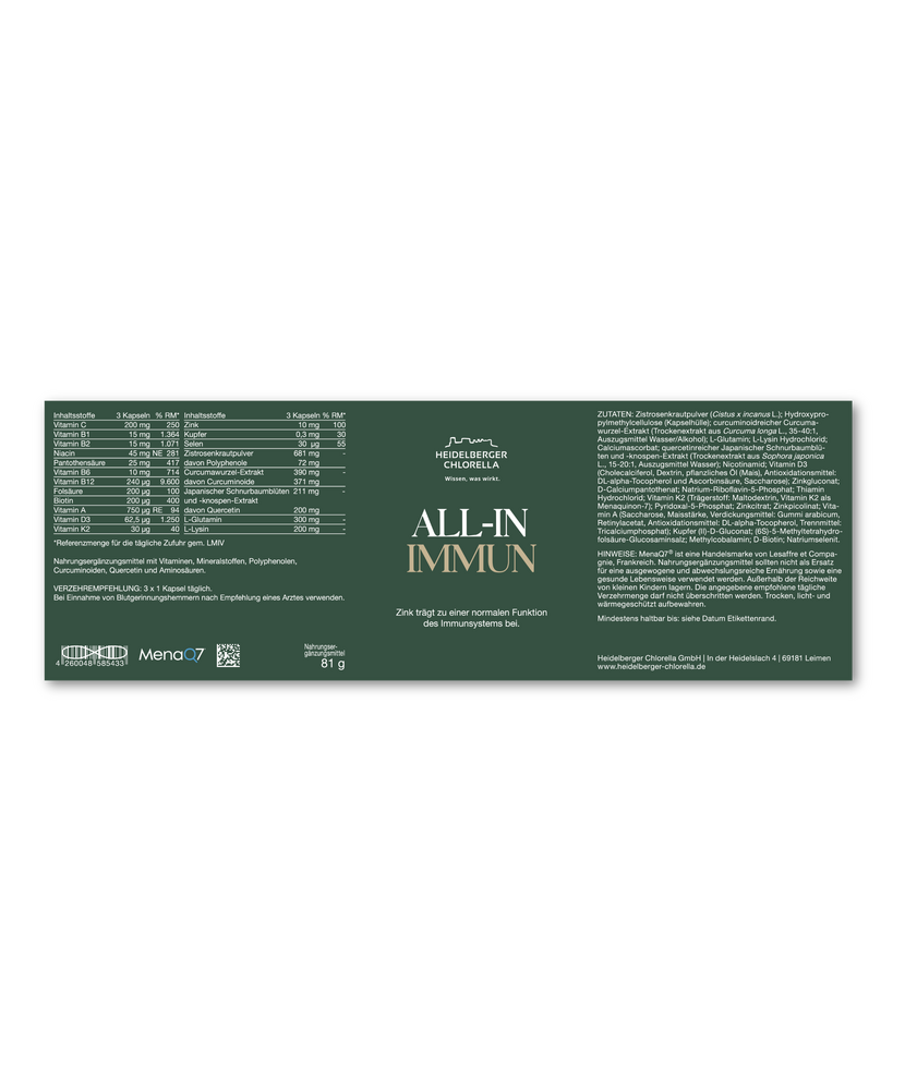 ИМУНИТЕТ - ALL–IN IMMUN е хранителна добавка, предназначена да поддържа вашата имунна система на оптимално ниво. Съдържащи витамини, минерали, полифеноли, куркуминоиди, кверцетин и аминокиселини, тези капсули осигуряват мощна подкрепа за вашето здраве.