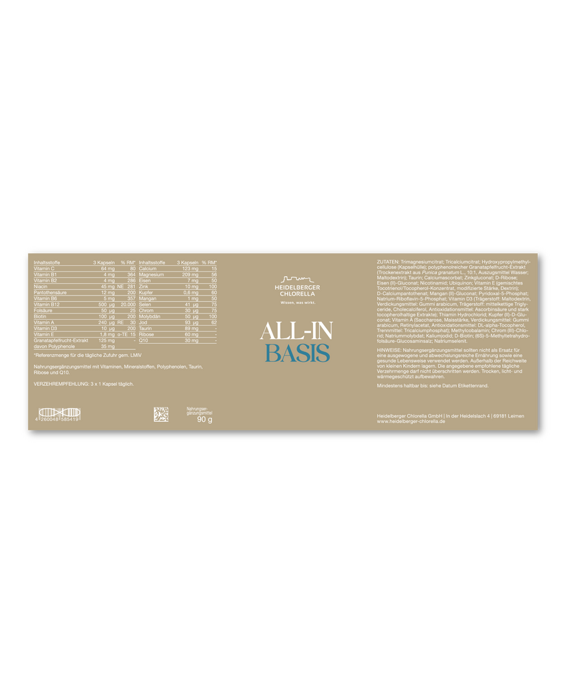 ОСНОВА - ALL–IN BASIS е иновативна хранителна добавка, специално проектирана да поддържа вашето здраве и енергийния метаболизъм. Със своите 90 капсули, тази уникална формула комбинира витамини, минерали, полифеноли, таурин, рибоза и Q10, за да предложи максимални ползи за организма.