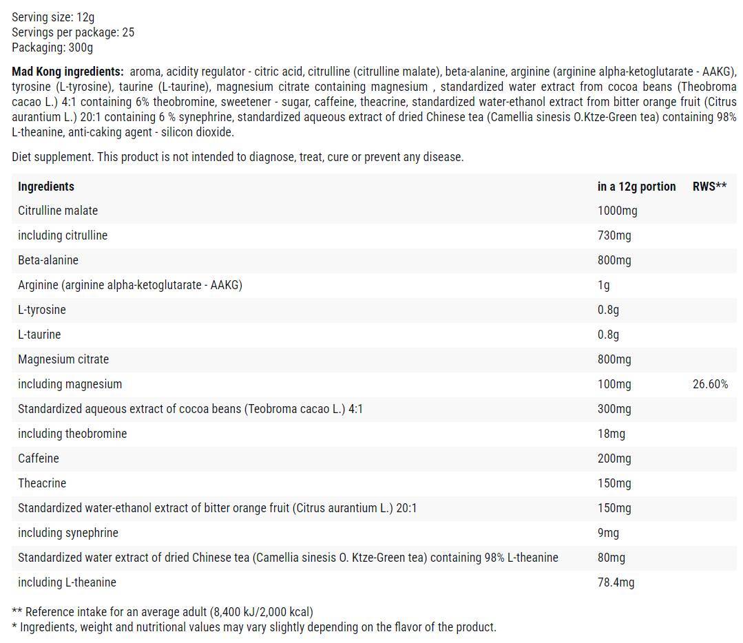 Mad Kong е изключителна предтренировъчна тренировка, която ще ви помогне да надскочите всички възможни граници на издръжливост, концентрация и сила. Създаден за хора, които постоянно търсят предизвикателства и методи за преодоляване на собствените си ограничения. Съдържа съставки като теакрин, който осигурява стимулация без типичните странични ефекти; синефрин, повишаващ термогенезата, подпомагащ метаболизма и допринасящ за по-ефективно изгаряне на мазнини, или рядък екстракт от какаови зърна с подобряващи настроението свойства.