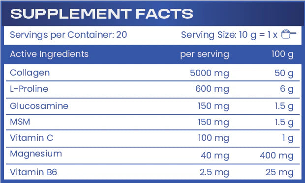 Collagen FLEX осигурява хидролизиран колаген тип I и III, витамин C, Л-пролин, глюкозамин, MSM, магнезий и витамини B6 и C. С възрастта производството на колаген намалява, което прави добавките още по-важни за поддържане на костната и ставната здравина. Дори и за по-млади хора, колагенът е полезен за защита на ставите, поддържане на мускулната тъкан и ускоряване на възстановяването.