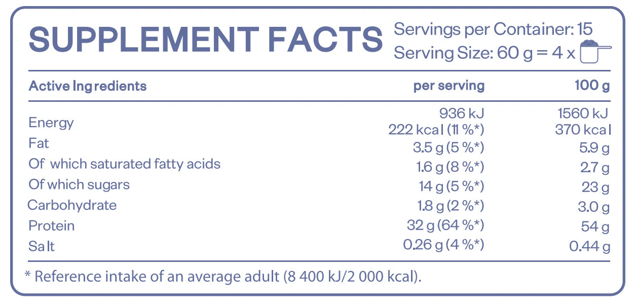• Осигурява повече от 30 г протеин и около 14 г въглехидрати на доза.