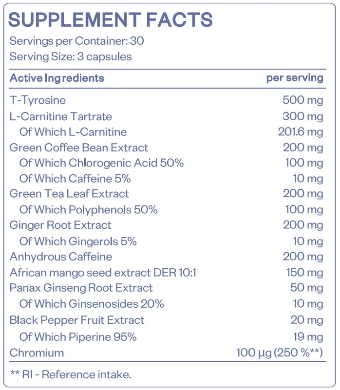 В състава му ще откриете тирозин – аминокиселина, която подобрява фокуса и настроението; кофеин, екстракт от зелен чай и зелено кафе за силно енергизиращо действие и антиоксидантна защита; горчив портокал за намаляване на умората и апетита; корен от джинджифил за ускоряване на обмена на веществата; както и лют пипер с капсаицин за допълнителна термогенеза. При комбиниране с правилен хранителен режим и редовни упражнения THERMO BURNER подпомага дългосрочни резултати.