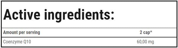 СЪСТАВ: малтодекстрин; обвивка на капсулата (желатин; цвят – титанов диоксид); коензим Q10 (6,0%); средство против слепване – магнезиеви соли на мастни киселини.