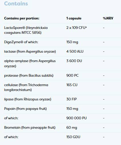 Съдържа комбинация от ензими във формулата Digezyme и пробиотика LactoSpore, които подпомагат ефективното разграждане на храната, облекчават газове и тежест след хранене и допринасят за здравословния баланс на чревната флора. Подходяща за хора с чувствително храносмилане, за лица, които консумират по-тежки и богати на мазнини храни, както и за всички, които искат постоянна подкрепа за храносмилателния комфорт.