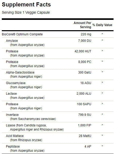 Предлагаме ви най-усъвършенстваната ензимна формула. Swanson Ultra BioCore Optimum Complete включва специални ензими, които въздействат на ензимния храносмилателен процес. Сред съставките ще намерите лактаза, която подобрява смилането на лактозата в млечните продукти; алфа-галактозидаза, която улеснява разграждането на определени въглехидрати в зърнените храни и зеленчуците; и ацид малтаза, която съдейства на тялото да смели малтозата, често срещан междинен захарид в храносмилателния процес. Всеки ензим в комплекса BioCore Optimum подпомага храносмилателния процес и стимулира редовността.